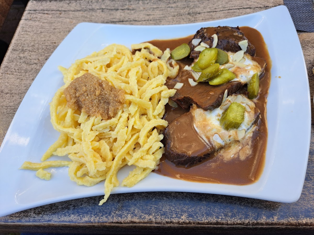 Wir waren als Gruppe an einem Mittwoch Abend im Restaurant zu Gast. Mittwochs gibt es hier ein spezielles Angebot mit Rostbratenvariarationen. Die gewählten Speisen, vor allem die sehr leckeren Rostbratenvariationen waren durchweg sehr gut. Zusätzlich gibt es auch einen Schnitzeltag und schwäbischen Tag mit jeweils besonderen Angeboten. Personal sehr freundlich. Kostenlose Parkplätze vor dem Eingang vorhanden.